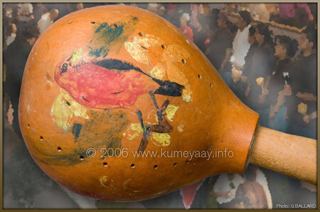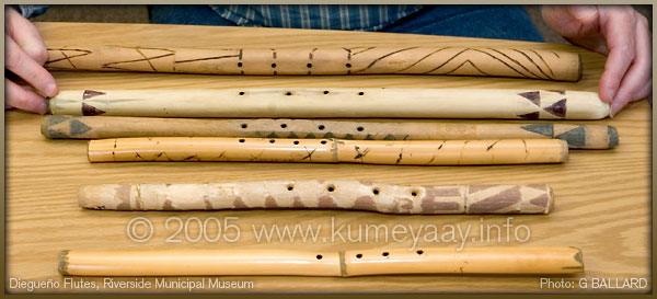 Слева: Кумеяайские флейты из бузины (конец 19 — начало 20 вв.) Справа: Старая Кумеяайская погремушка (19 век)
