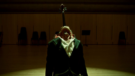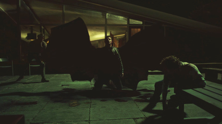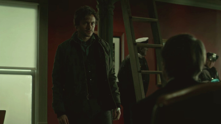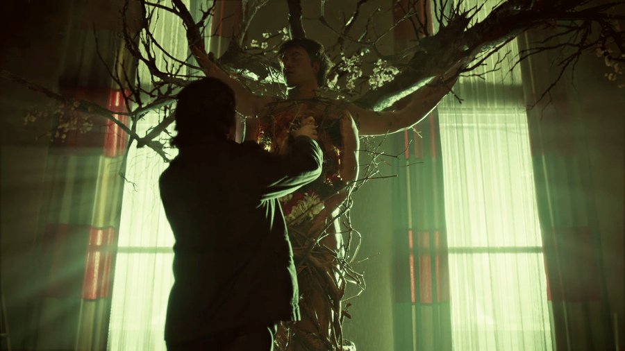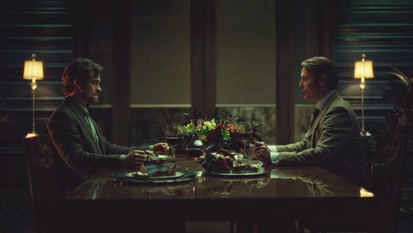 В эпизоде с торжеством в доме Лектера представлена более изысканная, сдержанная обстановка: гости одеты в элегантные костюмы, употребляют роскошные блюда, освещение затемнённое, а сами персонажи разделены на небольшие группки, многие повёрнуты друг к другу спинами. Однако композиция кадра будто выдаёт всё ту же причастность героев к низшему, животному миру: «божественный» взгляд сверху помогает различить каждого гостя по отдельности. Люди всё так же пьют вино и шампанское, закусывают деликатесами из человеческого мяса, оставаясь в блаженном неведении.
