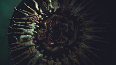 В одном из эпизодов убийца сшивает человеческие тела друг с другом и располагает их по оттенкам кожи, создавая инсталляцию из уже мёртвых людей. Визуально это напоминает потолок Зала гигантов в Палаццо дель Те или щит Ахиллеса, на котором изображены все аспекты жизни наравне с человеческой цивилизацией. Все три изображения имеют циркулярную композицию, собранную из людских фигур. Фреска раскрывает историю о небесном боге Юпитере, покинувшем трон ради сражения с гигантами. По сравнению с инсталляцией из мёртвых тел и щитом Ахиллеса, композиция динамичная и живая, будто воздушная, что делает изображение возвышенным и соответствующим сюжету. Если к потолку Зала гигантов можно провести аналогию с зарождением жизни, то к щиту Ахилла — с её циклом, а к фреске из сериала — со смертью.