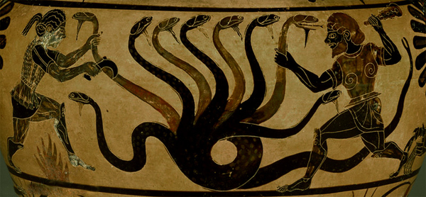 Чёрнофигурная вазопись «Гидра, Геракл, Иолай» (450-500 г до н. э.) / «Ганнибал» (2013-2015), реж. Брайан Фуллер. Ганнибал и Уилл убивают Красного Дракона