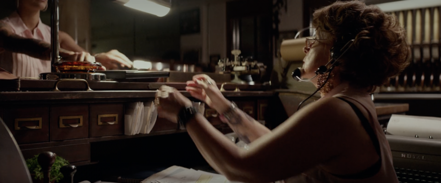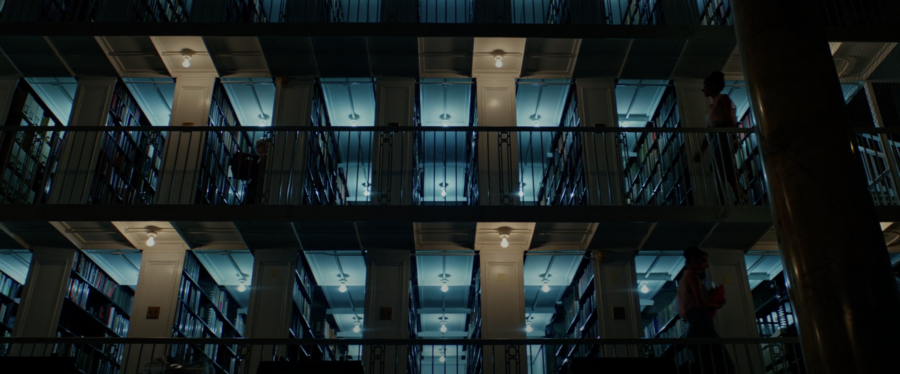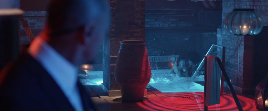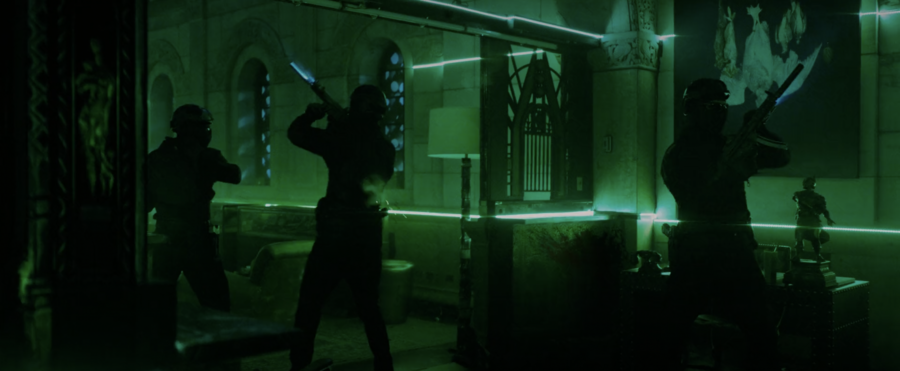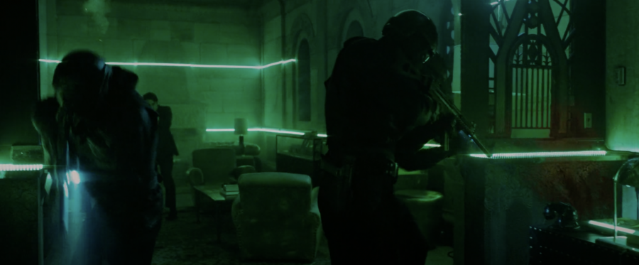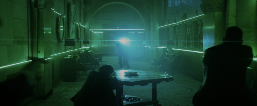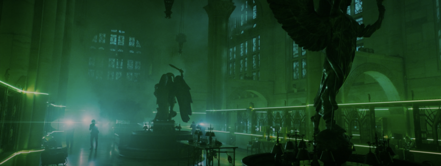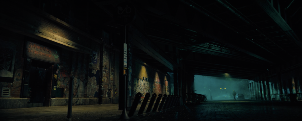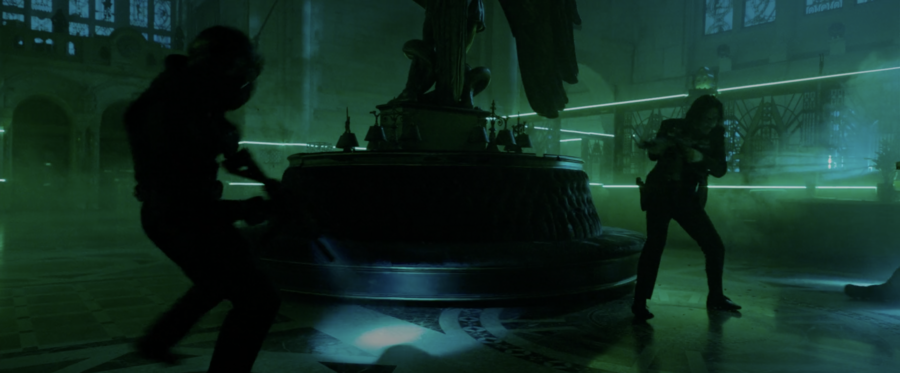 Удивительным образом Нью-йоркский Континенталь в определённый момент перестаёт принадлежать верхнему слою. На кадрах хорошо видно, как пропадает его характерный тёплый, дорогой свет, связанный с роскошью и строгими правилами. Вместо этого появляется яркая неоновая зелёная подсветка, которая обычно присутствует в пространствах среднего слоя.
