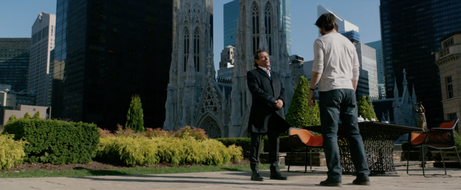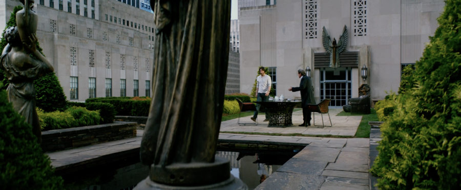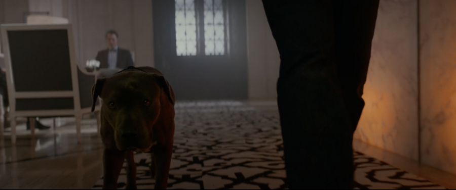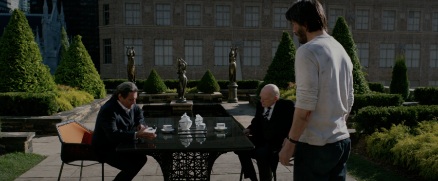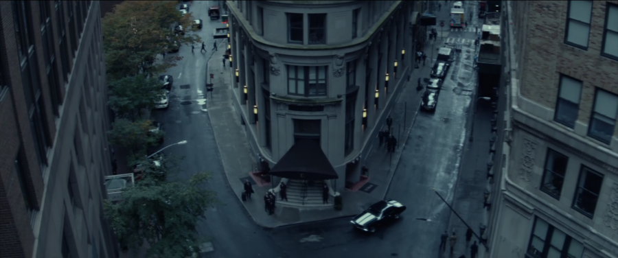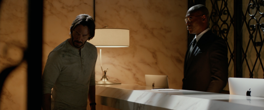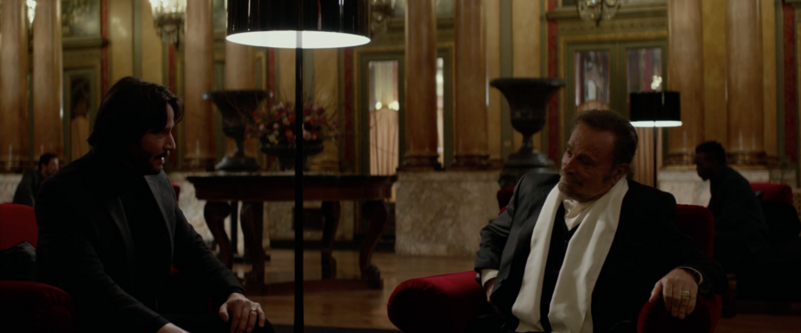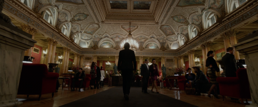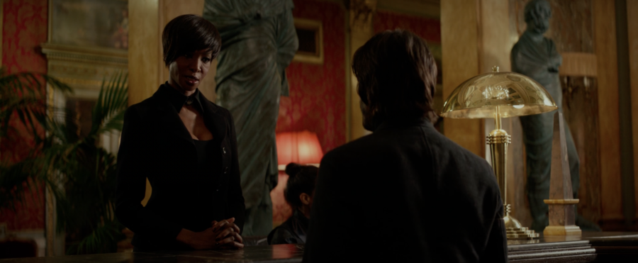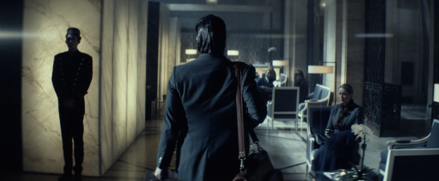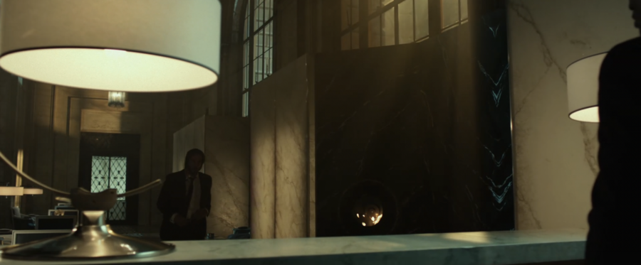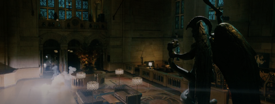 Нью-йоркский Континенталь выглядит роскошным и строго организованным. Здесь всё построено на дорогих материалах: мраморная стойка консьержа, камин, декоративные панели и ковры с золотистыми ренессансными орнаментами. Отдельного внимания заслуживает оникс, которым отделана часть панелей. Это материал класса люкс, и его использование в пространстве гостиницы превращает интерьер в почти сакральный объект: он становится светящимся фоном для всего, что происходит в кадре.