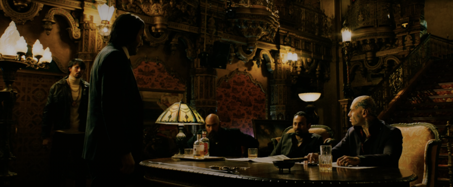 Когда Уик приходит к своим старым друзьям и знакомым, в пространстве все еще сохраняется порядок. Например, к «Руска Рома», момент, когда его мир не окончательно развалился. Он понимает, что опасность усиливается, но у него пока есть те, к кому он может обратиться, и интерьер это отражает. Это территория, где действуют правила, где ему дадут убежище, оружие и поддержку. Поэтому такие эпизоды я тоже отношу к верхнему слою — это места, в которых Джон ещё опирается на связи и на старую структуру, которая пока держится.