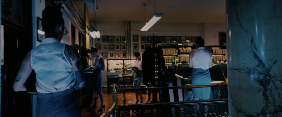 Заметив эти переходы, я выделила для себя три «слоя», которые в дальнейшем регулярно повторяются во всех фильмах. Первый, верхний слой — это мир элиты, порядка и правил. Сюда относится «Континенталь», роскошные залы, музейные пространства, мрамор, симметрия, золото. Каждый фильм начинается именно здесь. Это пространство строгой структуры, где всё подчинено кодексу и правлению. Мне важно подчеркнуть, что визуально этот слой всегда самый аккуратный. Я воспринимаю его как символ системы, которая пытается контролировать и героя, и весь мир киллеров.