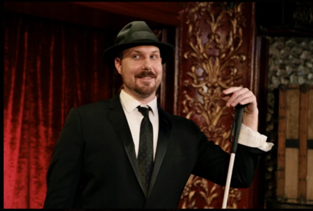 Чэд Аллен на презентации аудиокомикса UNSEEN. Фото демонстрирует автора с тростью и фирменной символикой проекта.