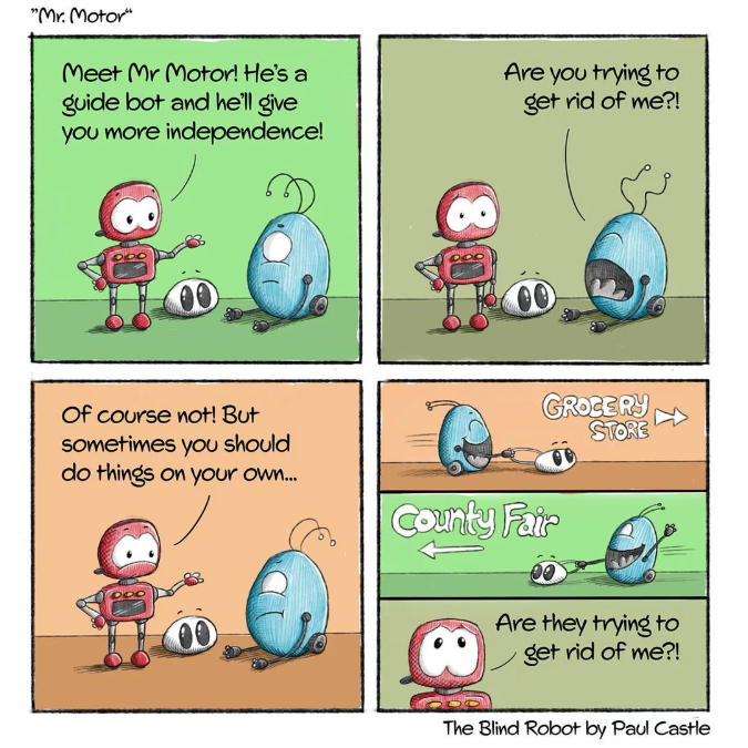В эпизодах «Forgot» и «Mr. Motor» Пол Касл сочетает юмор и философию, чтобы показать, как персонажи со слепотой воспринимают мир через эмпатию, доверие и интуицию. Его герои — роботы — не просто машины, а образы внутреннего зрения, способные чувствовать через звук, прикосновение и воображение. Простота визуального языка делает эти сцены эмоционально доступными: яркие плоские цвета и лаконичные диалоги превращают абстрактную тему инвалидности в понятный разговор о дружбе и поддержке. Комикс не говорит о потере — он говорит о способах видеть по-другому.