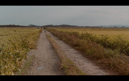 Сцена обнаружения первого тела в канаве. Широкий план фиксирует сельскую дорогу, где дети спокойно играют неподалёку от трупа — это создаёт противоестественный контраст обыденности и насилия. Кадр строится так, чтобы пространство «пожирало» персонажей — они выглядят маленькими, слабыми, беспомощными.