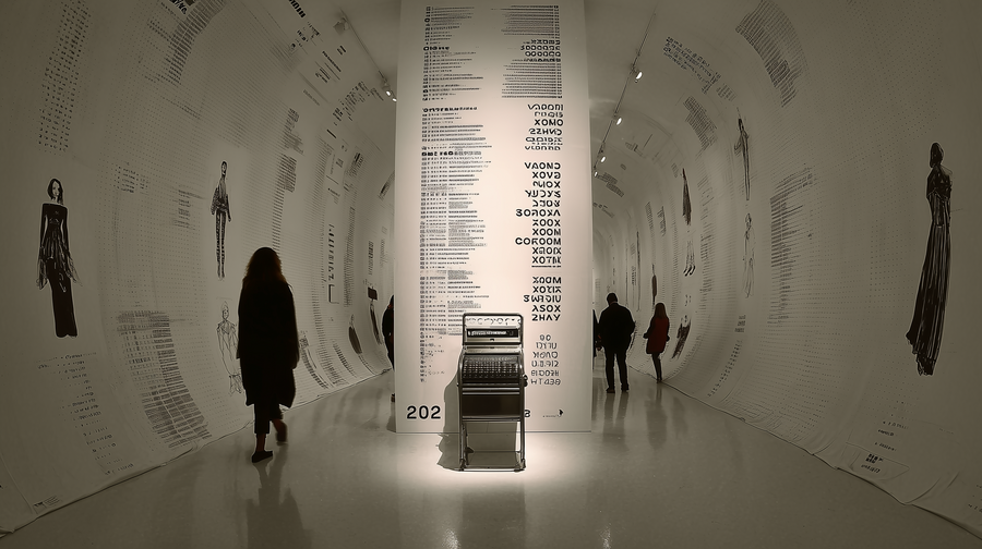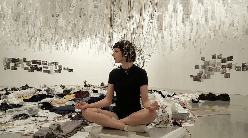 Инсталляция с девушкой, физически «подключенной» к бесконечным лентам собственных чеков. Это метафора памяти: каждая покупка — не просто транзакция, а зафиксированное воспоминание