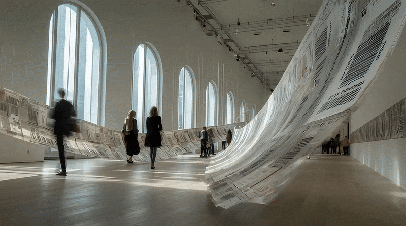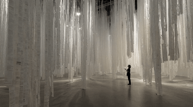 Зал 5: Город в чеках В высоком зале тысячи чековых лент свисают с потолка, напоминая лианы джунглей. Проходя сквозь этот тактильный «архив», вы буквально кожей ощущаете плотна