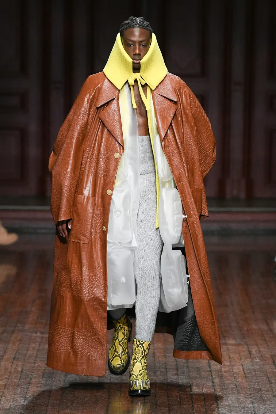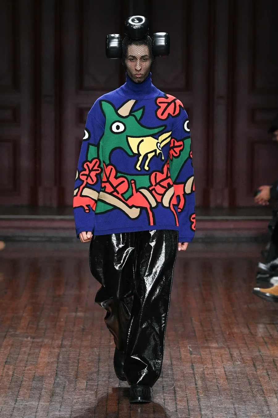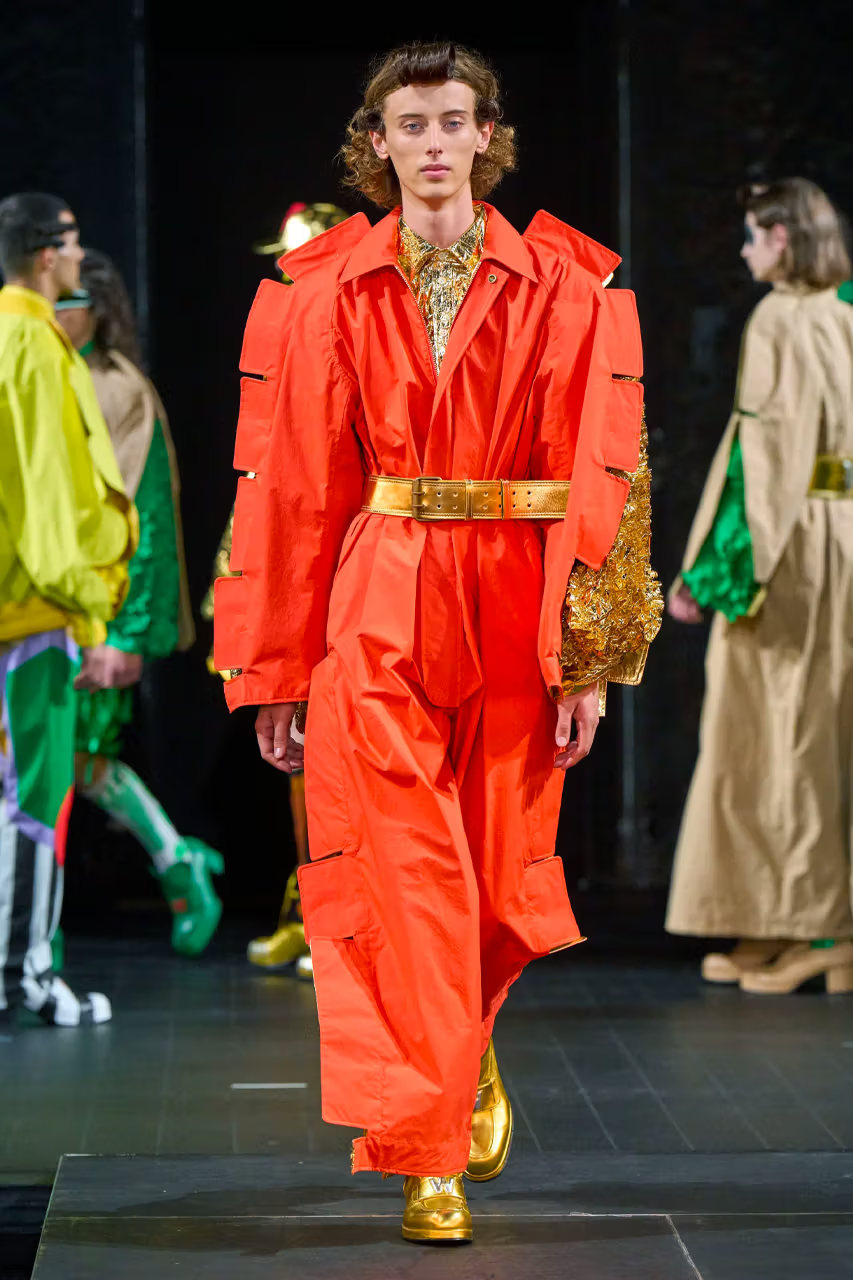 Если ритуальный костюм защищал от духовных сил, то дизайнерская «броня» Ван Бейрендонка защищает от давления социума, от стереотипов и норм. Он создает форму, в которой человек проявляется через утрирование, преувеличение, контраст. Тело скрыто, но личность становится заметнее. В этих костюмах важен не силуэт в привычном смысле, а структура движения и взаимодействия формы с пространством. (PFW Men’s: Walter Van Beirendonck FW23 Collection)