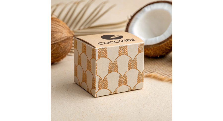 Recraft.ai. Prompt: Set up store for CocoVibe, a cosmetic coconut oil brand inspired by beauty, health and hair and skin care. On a background of neutral textures, using natural colors such as brown, sand, beige, white