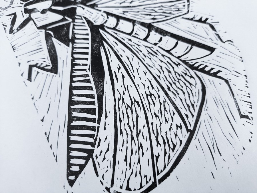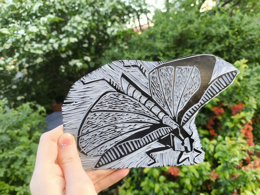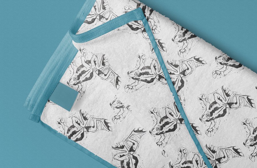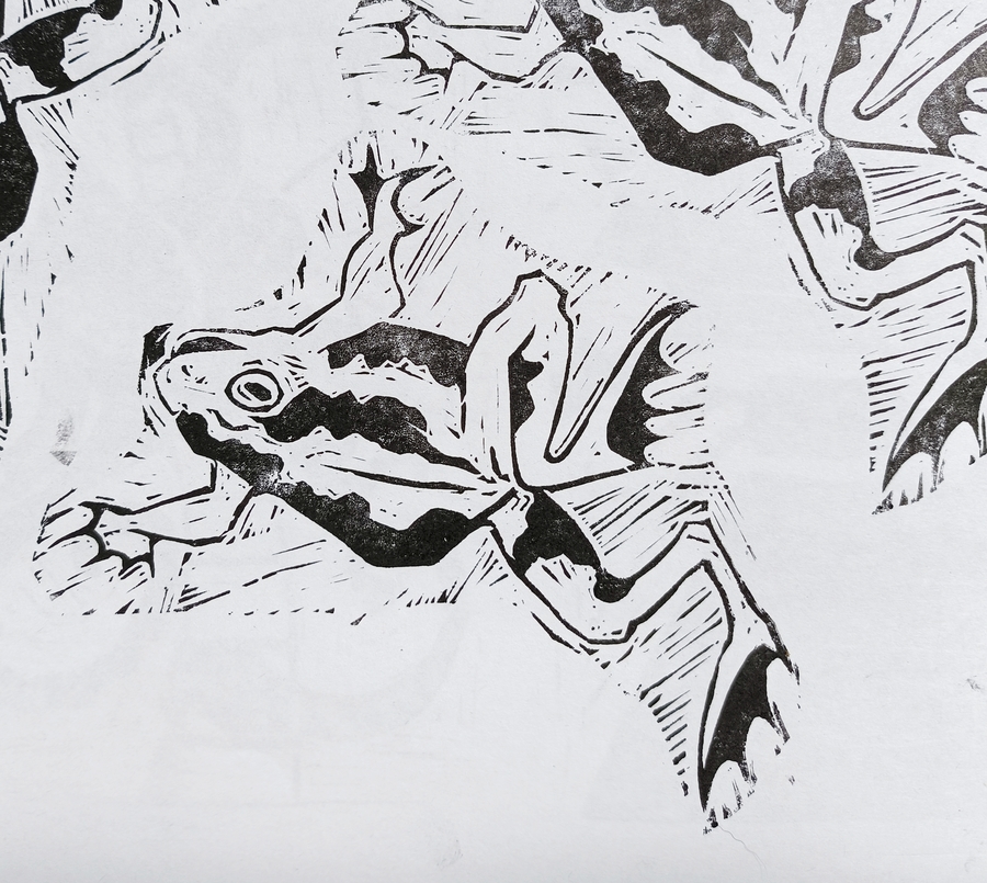 В рамках творческого проекта я вырезала линогравюры по мотивам казней — нашествие саранчи и жаб — и сделала из оттисков них принт для ткани, превращая образы кары божьей в часть повседневных предметов.