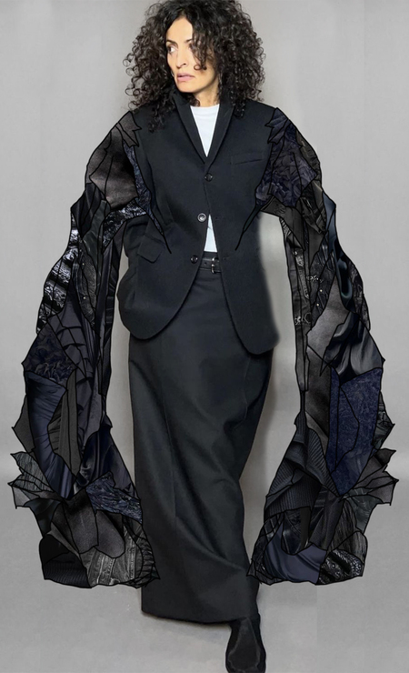 При соединении обрезков ткани остающихся от швейного производства образуются случайные объемы и формы, во избежание которых дизайнеры, работающие с апсайклингом, срезают фигурные края у лоскутов, либо настрачивают их друг на друга для создания плоского полотна. В данном же проекте случайность формы становится намеренным визуальным приемом. Источником вдохновения стала актуализированная версия искусства кинцуги, когда разбитый фарфор соединяют не в ту форму, которой он был изначально, а в совершенно новую, абстрактную. Таким образом статичный классический сервизный набор превращается в настоящее произведение современного искуссства. Более того, мы часто можем видеть подобные проявления в наших реалиях, когда где-нибудь разбивается плитка и вместо того чтобы разворачивать полномасштабные ремонтные работы, эту плитку приклеивают на цемент «как рука возьмет», в результате чего получается новый рисунок кладки.
