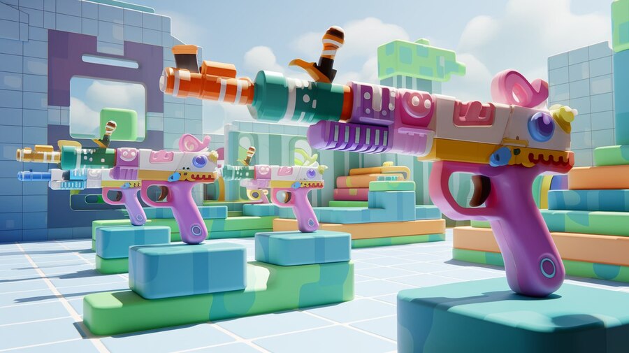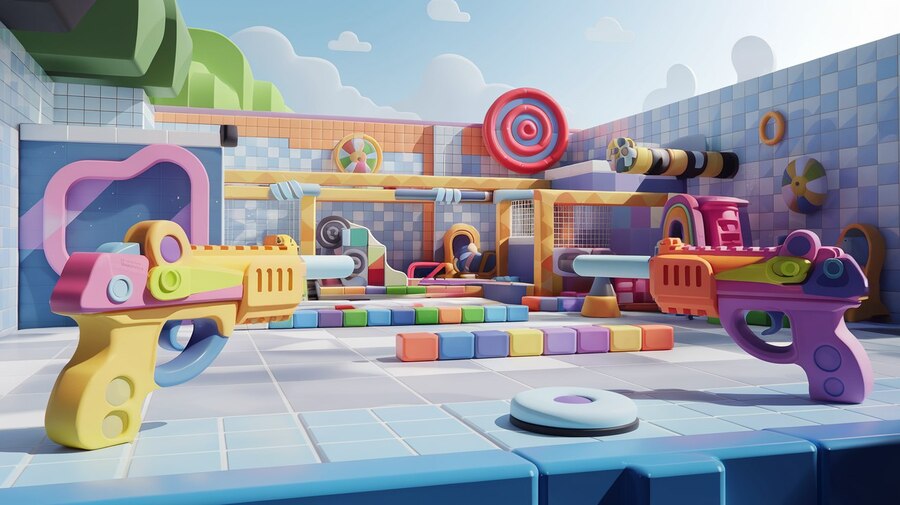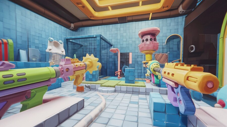 Промпт: a big indoor shooting playground for foam guns, the environment is remeniscent of bathrooms, but in a decorative sense. there are some obstacles like in 3D platformer games. the design of foam guns is whimsical, like it’s mish-mash of different parts. the colors are bright and cartoonish