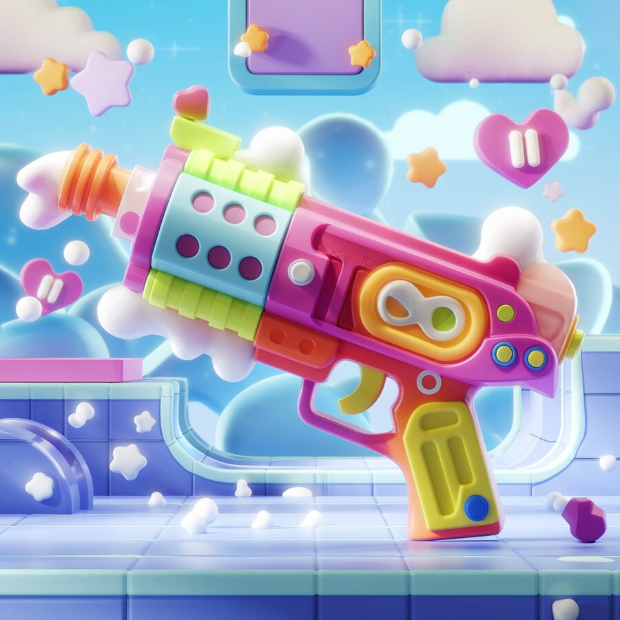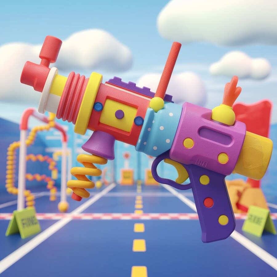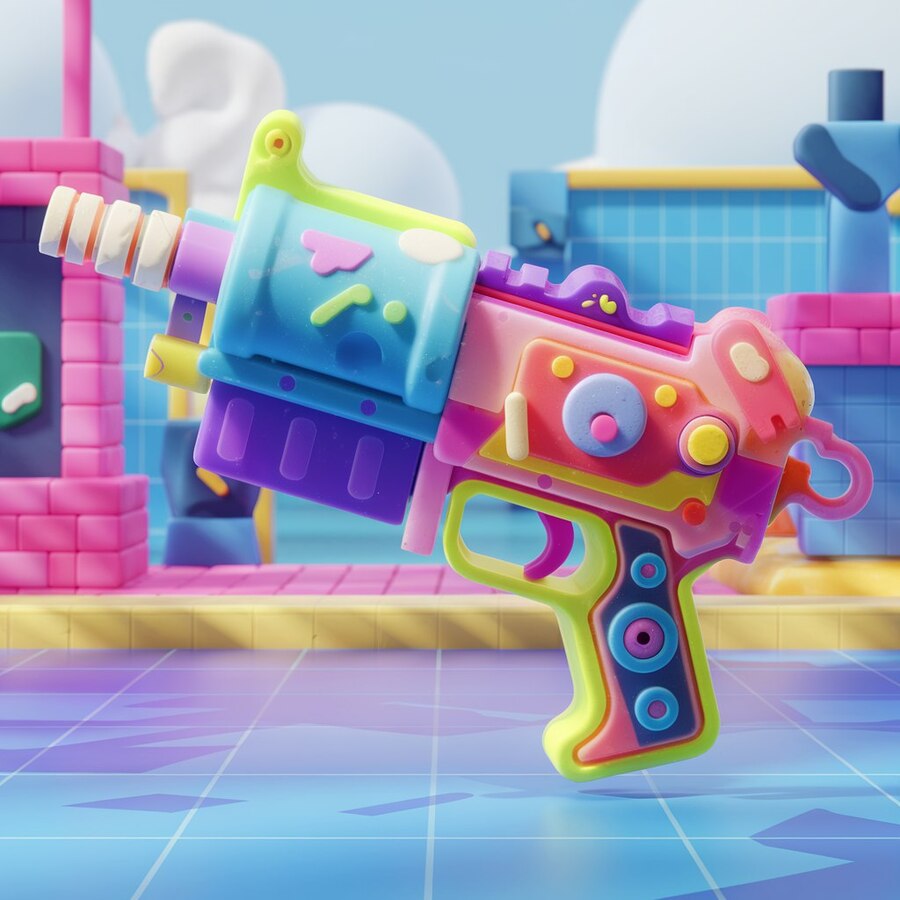 Промпт: a stylised foam gun, whimsical design with bright colors, like for a fun shooting game. It looks like a mish-mash of different parts. the background is similar to a fun platformer video game environment.