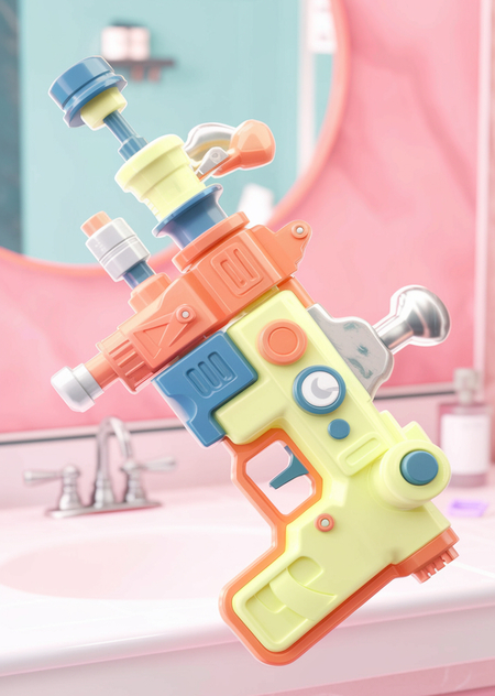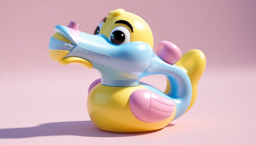 a whimsical, stylised foam gun in a vibrant colour palette featuring pastel hues of pink, blue, and yellow. The foam gun is in the shape of a stylised frog. The frog’s body is smooth and curved, with a glossy finish, and the foam nozzle is shaped like a duck’s bill. The overall aesthetic is playful, fun, with bold lines and rounded shapes. The lighting is soft and even.