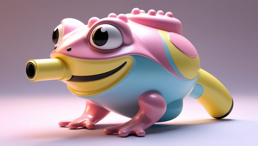 Промпты: a whimsical, stylised foam gun in a vibrant colour palette featuring pastel hues of pink, blue, and yellow. The foam gun is in the shape of a stylised frog. The frog’s body is smooth and curved, with a glossy finish, and the foam gun’s nozzle is shaped like the frog’s mouth. The overall aesthetic is playful, fun, with bold lines and rounded shapes. The lighting is soft and even.