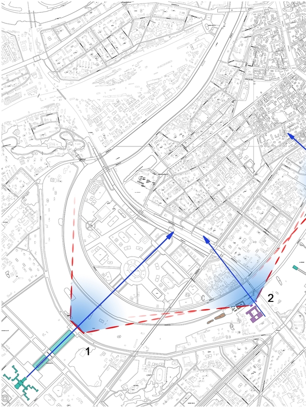 Река со смотровыми площадками, вид с которых охватывает всю городскую панораму. Видовые точки демонстрируют связь сложившихся исторических ансамблей с динамично развивающимся городом, его панорамами. Здесь зритель чувствует себя вовлеченным участником процесса создания городской среды.