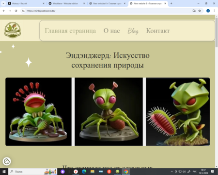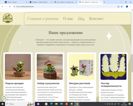 Так как продажи коллекции планируются через интернет-магазин, в приложении WebWave я создала макет сайта (промпт: Интернет—магазин ENDANGRRD— серия коллекционных фигурок-сюрпризов, посвященная вымирающим видам растений. Структура витрины: Шапка сайта: Логотип магазина, выполненный в креативном стиле, который отражает тематику коллекционных фигурок; меню навигации с пунктами: «Главная», «Каталог», «О нас», «Контакты», «Блог», «Скидки и акции».Главный баннер: Яркое изображение лучших фигурок из коллекции, с наложенным слоганом, таким как «Откройте мир уникальных коллекционных фигурок!»; Кнопка «Смотреть коллекцию».Раздел «Популярные товары»: Эстетически оформленные карточки товара с изображением фигурок, их названиями и ценами. Включите кнопки «Добавить в корзину» и «Подробности», а также рейтинг (звёздочки) отзывов. Категории товаров: Плашки или иконки, представляющие различные категории коллекционных фигурок. Особые предложения и акции: секция, выделяющая текущие акции и распродажи, с привлекательными изображениями и уведомлениями о скидках. Блог и новости: небольшая секция с последними статьями из блога о коллекционировании, новинках в мире фигурок, а также советами по уходу.
