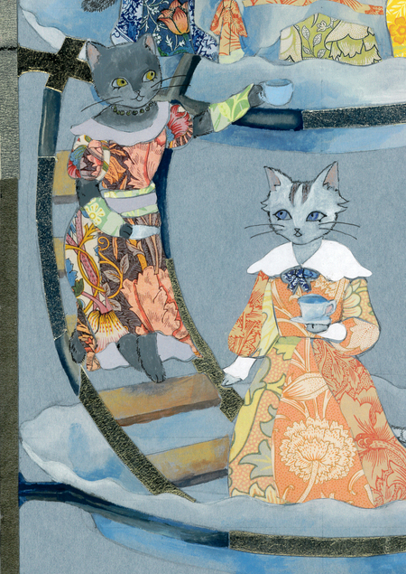 Путешествие по традиционным чаепитиям. Главная героиня — белая кошка, которая раскрывает секрет этого действия и пробует чай в таких странах, как Англия, Япония и Турция. В Англии мы видим традиционный 5 o’clock tea, в Японии — чайную церемонию, в Турции — полуденное чаепитие из стаканов индже бель. В работе использована смешанная техника — акварель и аппликация из цветной бумаги.