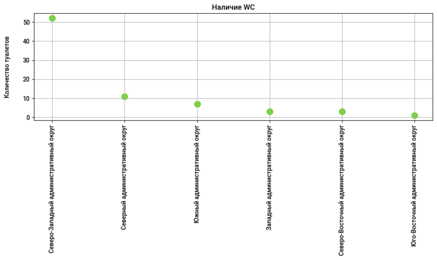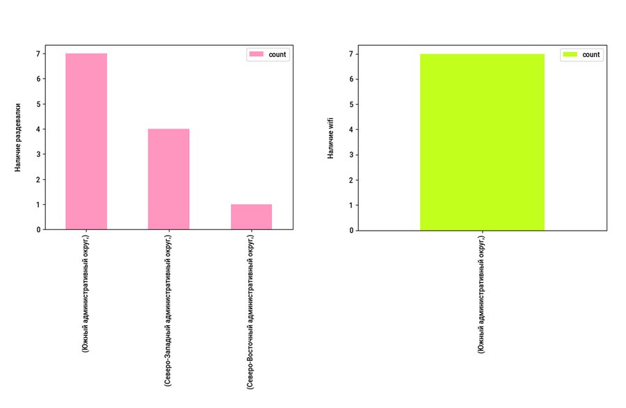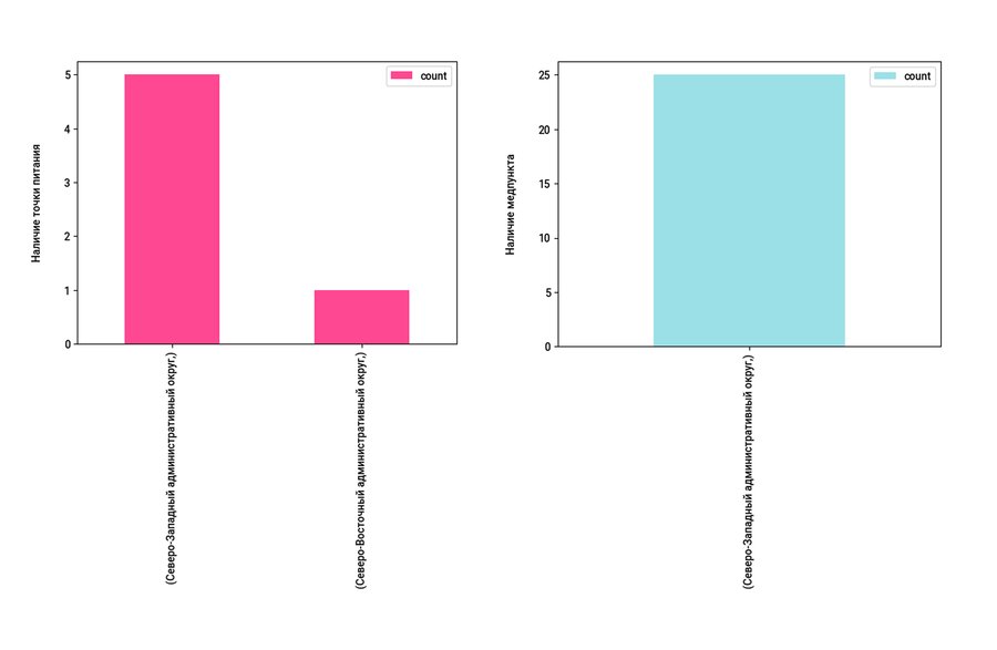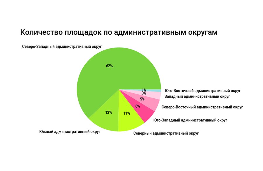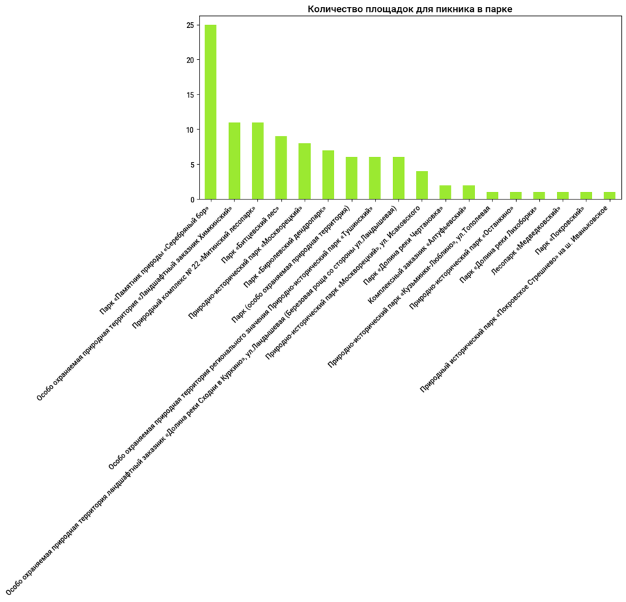 Северо-Западный округ Москвы имеет наибольшее количество зон для пикников. В парках данного района можно найти множество удобств: Северо-Западный округ лидирует по количеству WC и точек питания, а также является единственным округом, где в парке можно обратиться в медпункт. Однако, несмотря на масштабы, парковые зоны Северо-Западного округа не приспособлены для инвалидов в отличие от Южного округа, где частично можно проводить спортивные занятия для людей с ограниченными возможностями. Площадки Южного округа единственные из всех представленных районов имеют точки wi-fi, что позволяет совмещать работу и нахождение на природе. Северный округ опережает другие парки по количеству раздевалок, что позволяет комфортно и эффективно организовать тренировочный процесс. Парк «Серебряный бор» занимает первое место по количеству мест для пикника, что является большим преимуществом для больших компаний. Основываясь на данных статистики, Юго-Восточный округ не стоит рассматривать для выезда на природу.