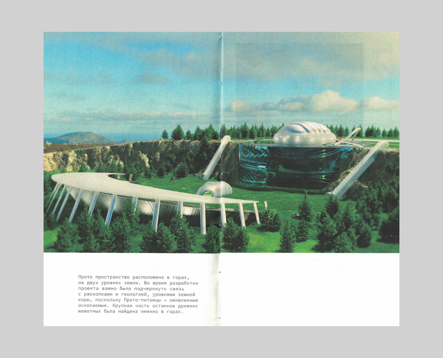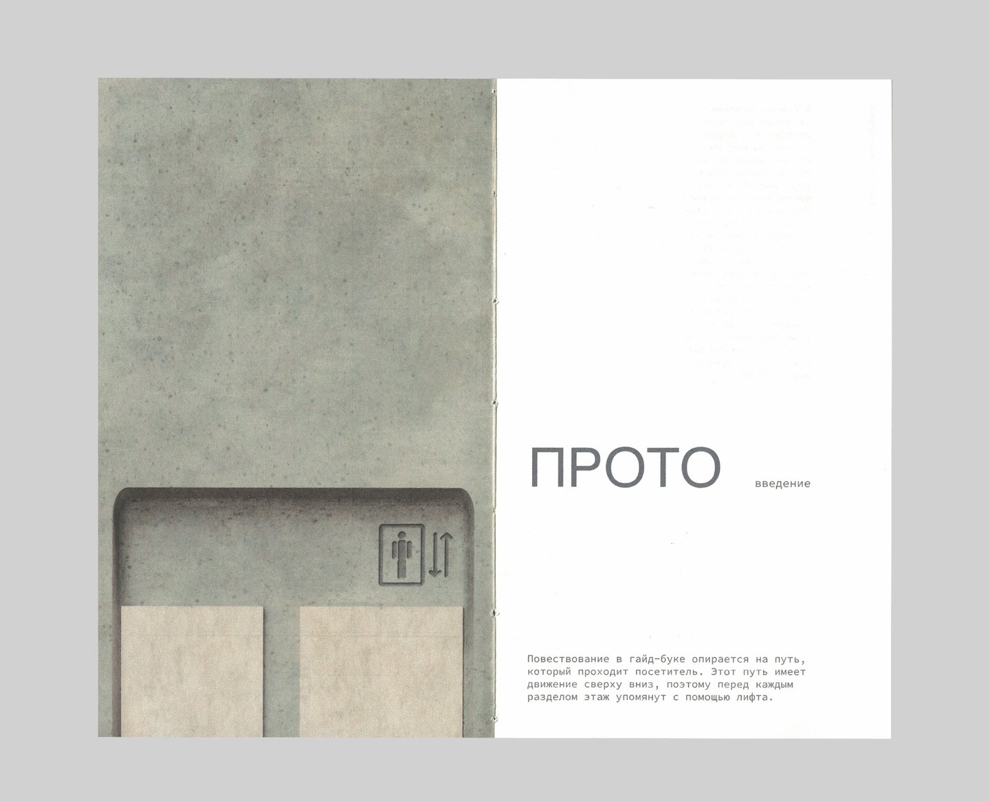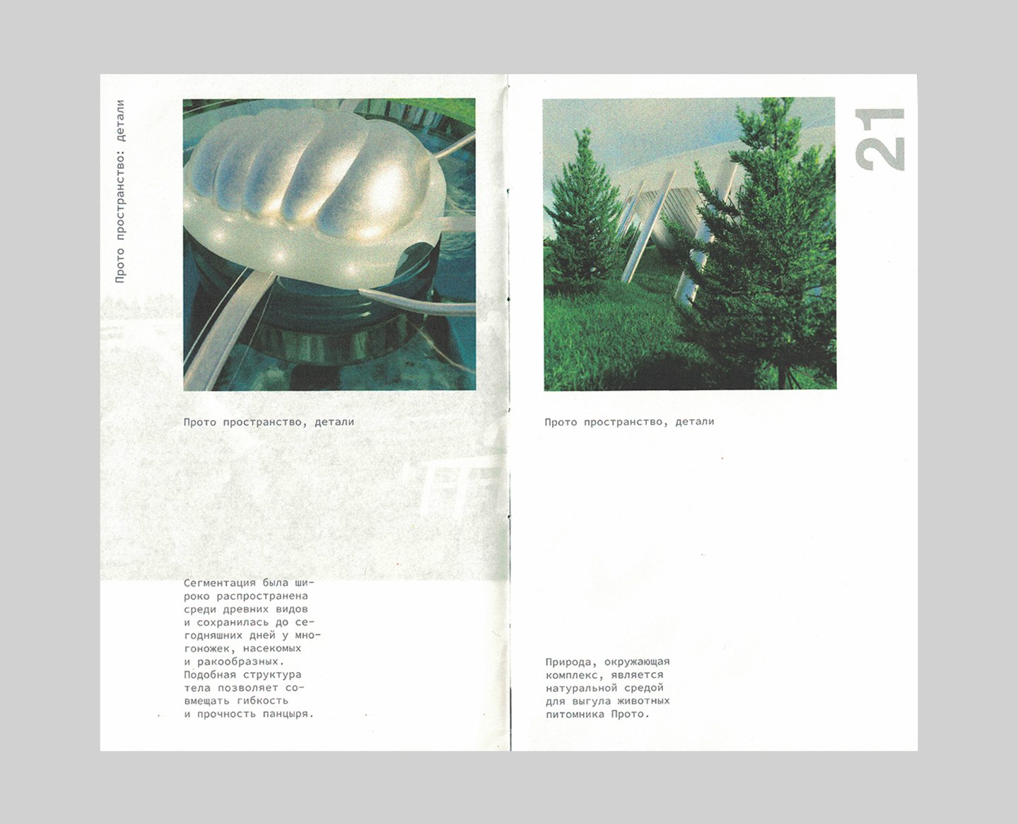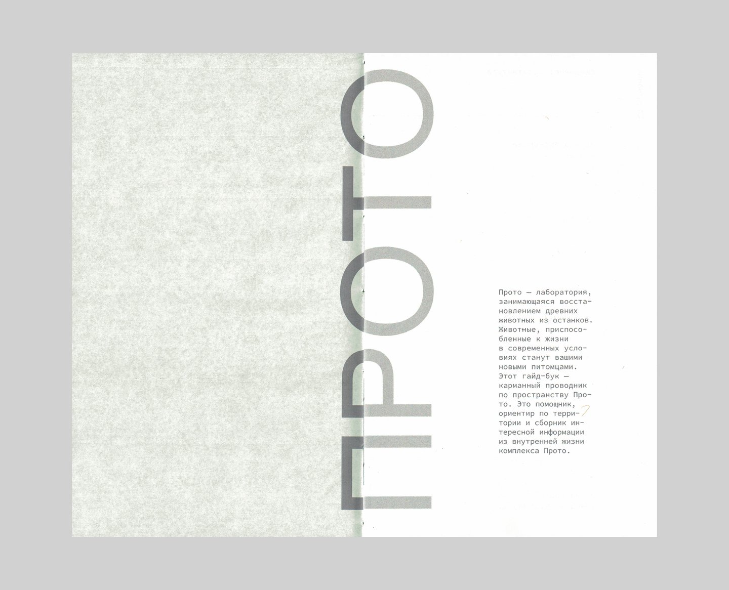 В палитре айдентики Прото два цвета — красный и зеленый. Цвет, принадлежащий пространству и печатному изданию — зеленый, потому что архитектурный ансамбль был вдохновлен природными элементами и интегрирует созданное человеком обратно в природу. Книга Прото — карманный гайд-бук для посетителей пространства, совмещающий элементы путеводителя и каталога. Гармония и баланс — фокус проекта здания и книги.