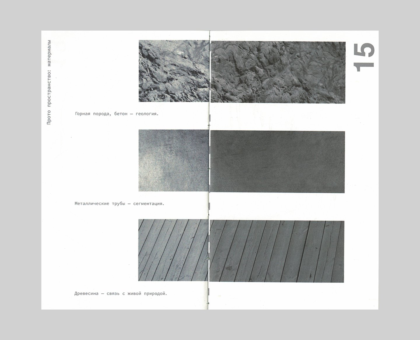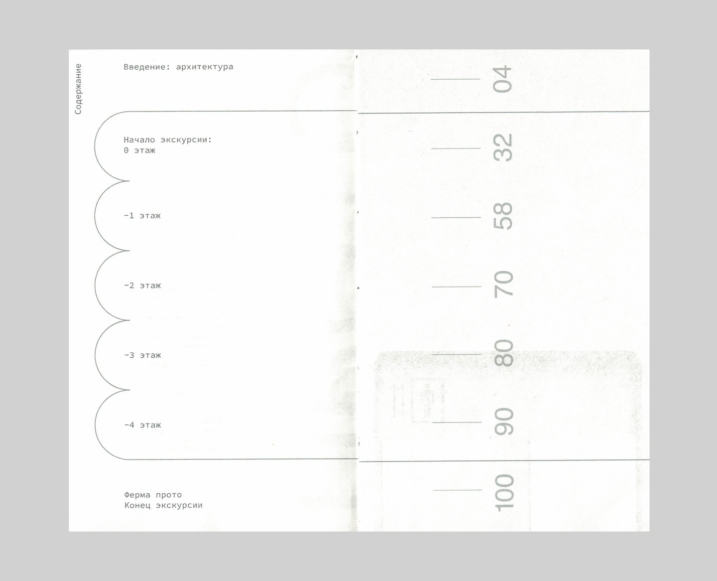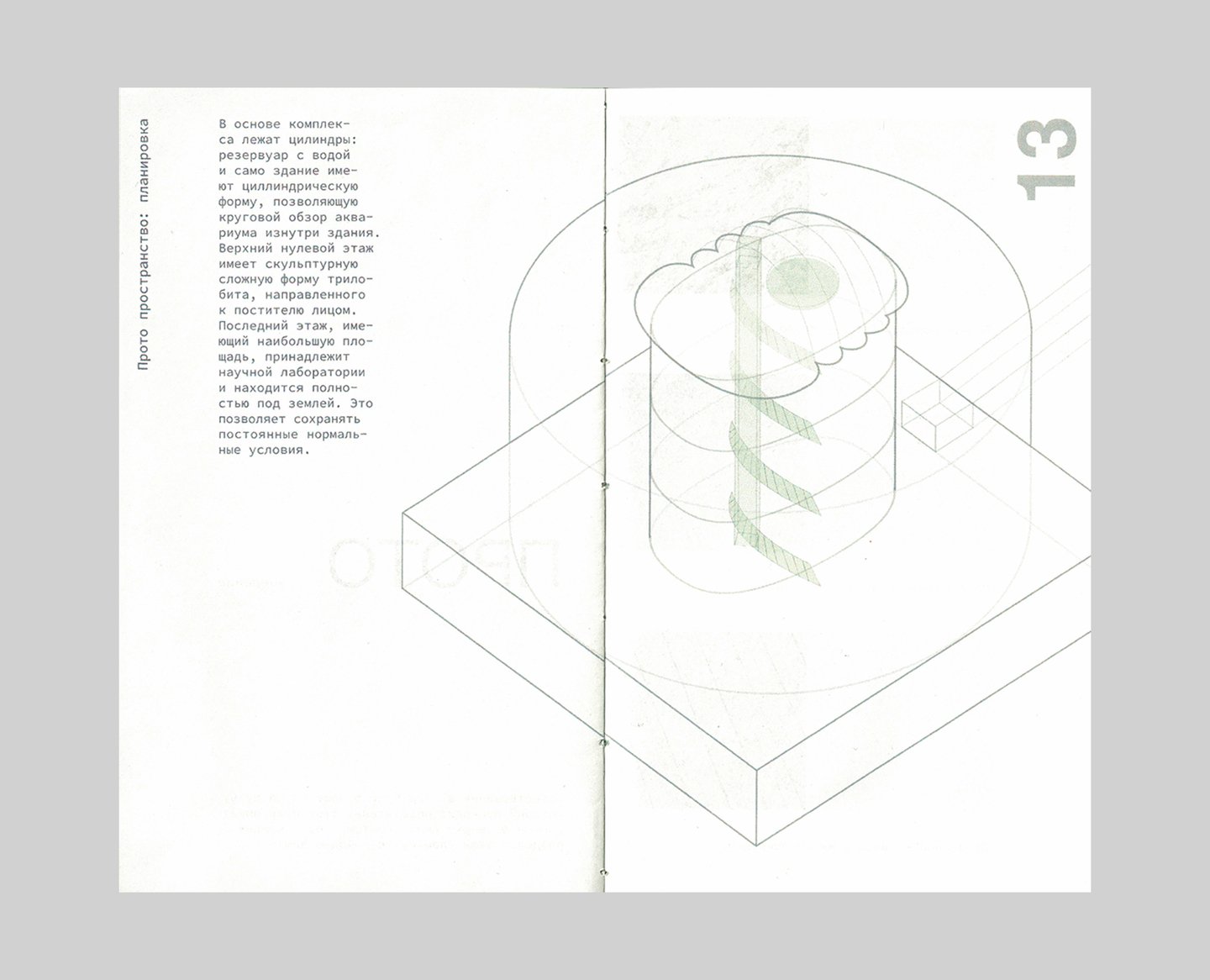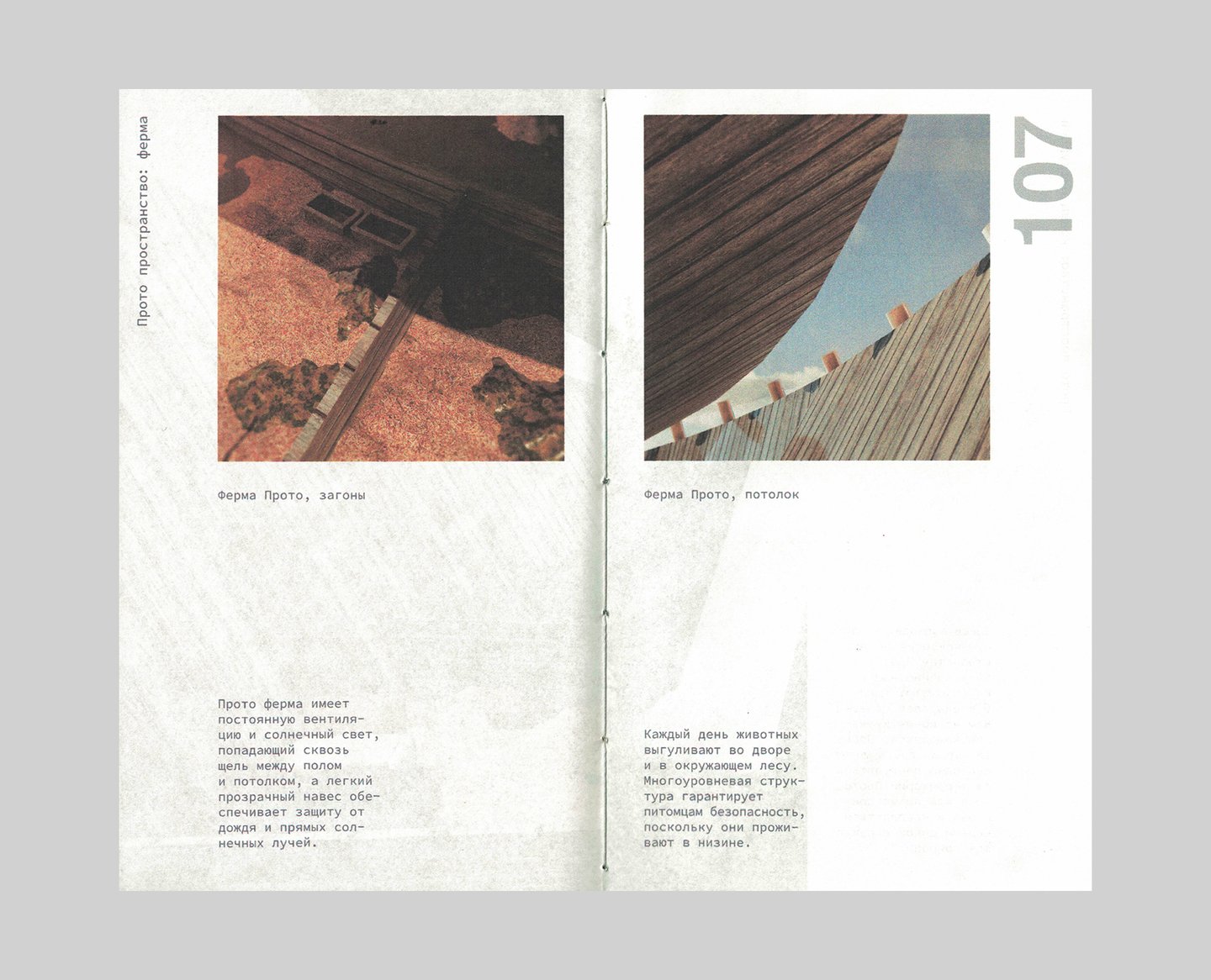 В палитре айдентики Прото два цвета — красный и зеленый. Цвет, принадлежащий пространству и печатному изданию — зеленый, потому что архитектурный ансамбль был вдохновлен природными элементами и интегрирует созданное человеком обратно в природу. Книга Прото — карманный гайд-бук для посетителей пространства, совмещающий элементы путеводителя и каталога. Гармония и баланс — фокус проекта здания и книги.
