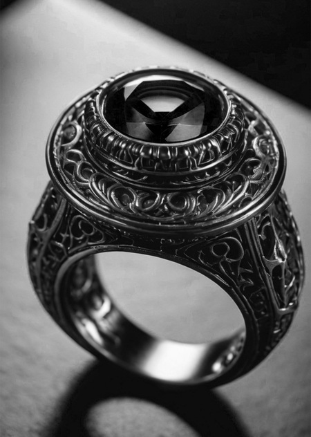 Stable diffusion prompt: Realistic image of a ring, in style of H.R. Giger mixed with classical patterns, Biomechanics, Jewellery photography, product photography