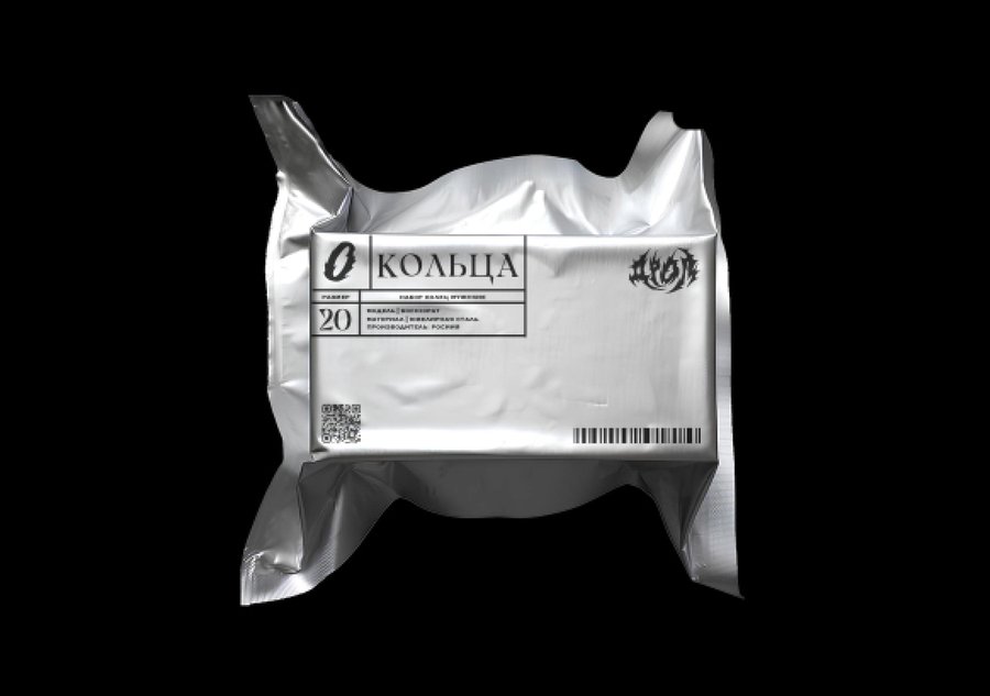 Prompt: make clothing packaging for sale in a grunge and cyberpunk clothing store. The packaging is similar to a vacuum small bag containing several rings using silver plastic and metal, a cold color scheme, 2 identical packages are lying on the table, the background is black, the light falls directly on them