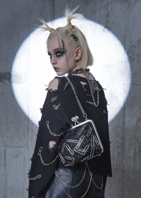 3. Prompt: make a poster for a grunge and cyberpunk clothing brand, with an adult girl in the center of the image, in the style of a studio photo shoot, a girl with short dark hair, she stands sideways, arms outstretched and holding bags, the girl’s body is slightly tilted, against a gray concrete wall, a bright white light shines on the girl like a spotlight, the girl is dressed in a short top with long sleeves in a mesh with chains and needles, the girl is wearing a short black leather skirt with needles, rivets and chains, the girl is wearing long leather boots with large heels, a small leather bag of a strange shape with chains and pins, the girl is wearing a lot of jewelry, chains of rings and necklaces, the girl is wearing dark makeup, The background is a grungy, industrial setting.