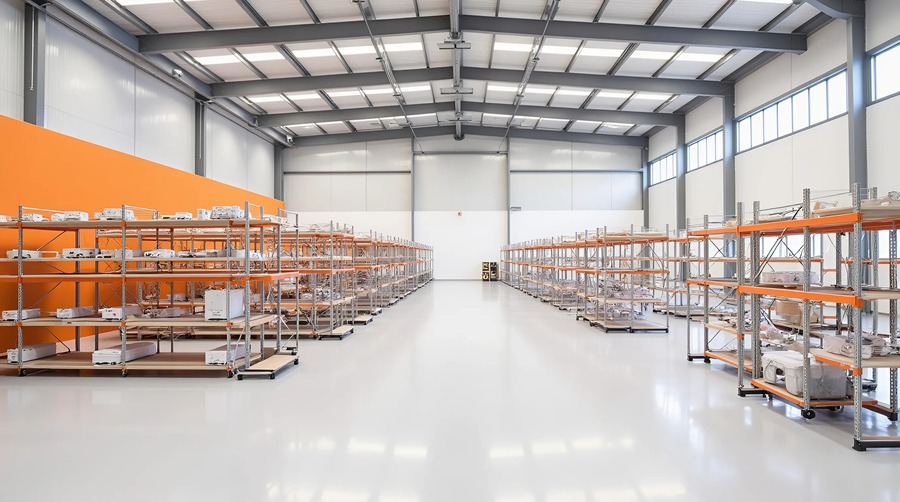 prompt: Design a bright and contemporary warehouse space tailored for a drone company. The primary color should be a vibrant orange (F58B3F), creating an energetic and dynamic atmosphere. Incorporate additional colors such as soft pink (F078A7), light orange (FFE9D3), and light blue (ECF0F7) to enhance the overall aesthetic. The majority of the space should be filled with bright white elements to maintain an open and airy feel. The layout should include areas for drone assembly, testing, and storage, with large windows allowing natural light to flood in. Use modern furniture and fixtures that complement the color palette, ensuring a cohesive and inviting environment. Add orange, pink and blue line navigation on floor