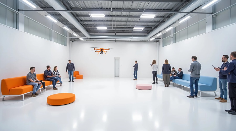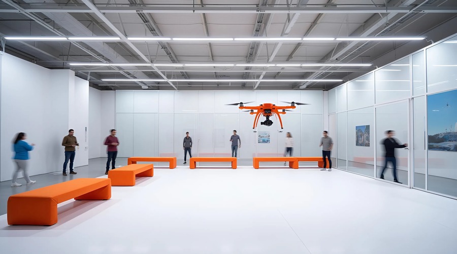 prompt: In a modern drone testing center, an atmosphere of innovation and creativity prevails. Bright colors like orange (F58B3F), soft pink (F078A7), light orange (FFE9D3), and light blue (ECF0F7) add energy to the space. The launch area features a clean white design, providing a fresh look with smooth surfaces for safety and convenience. High transparent panels surround the launch zone, allowing spectators to watch the process without risk. Stylish benches and comfortable seating create a cozy environment for交流 and idea-sharing. Bright directed lighting ensures excellent visibility at any time of day, while inspiring graphics and murals reflecting technological achievements add uniqueness to the space. As an orange drone takes flight, the operator focuses intently, while interested viewers observe the launch. This center serves not only as a testing ground but also as a hub for idea exchange and inspiration.