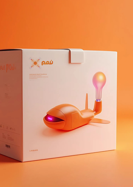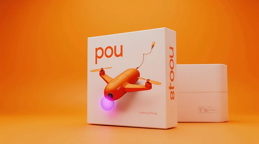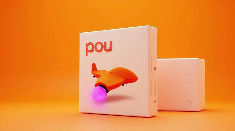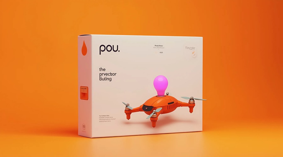 prompt: dynamic composition, macro product photography of a white box package with the name «pou» on it and with a print of an orange futuristic streamlined drone with a pink light bulb, studio lighting, stylish photorealistic 3d render, orange background