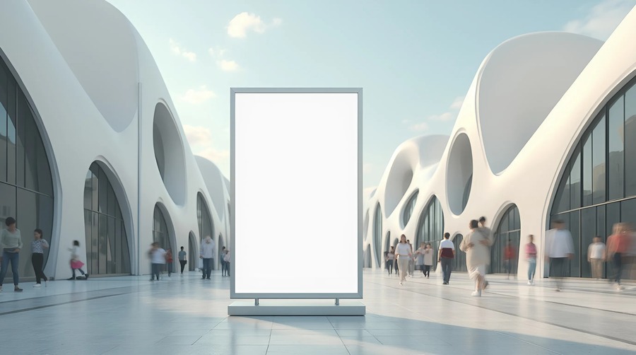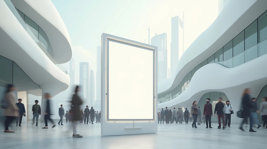 prompt: realistic minimalist layout for advertising a poster standing on a street with white futuristic zaha hadid style buildings, the city is new and modern. day, bright lighting. the object must be clearly visible. photorealistic, with people in motion blur