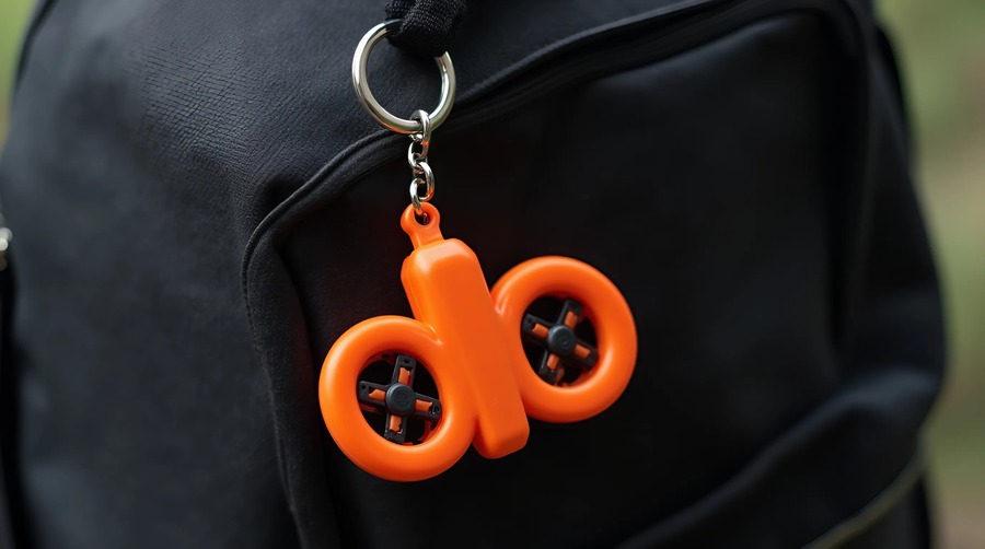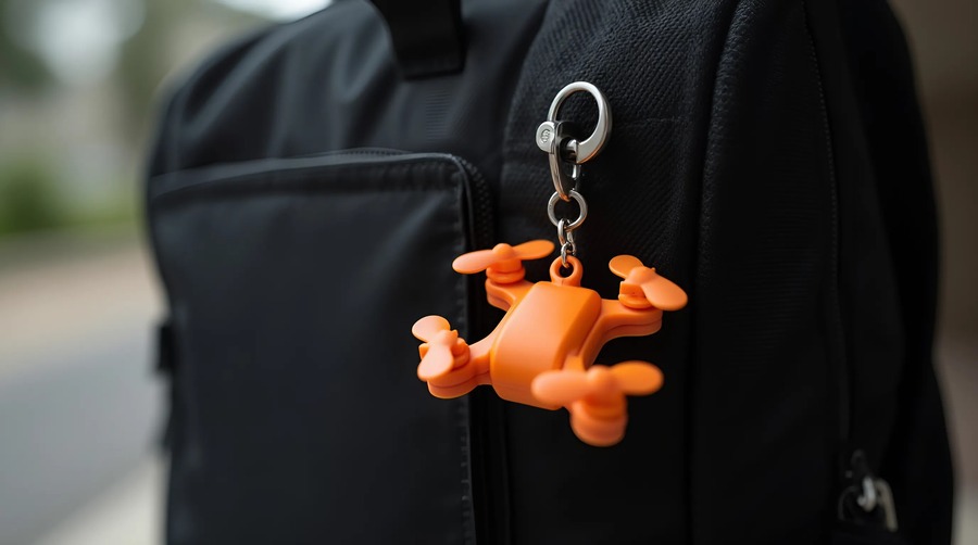 prompt: orange little keychain in the form of a plastic flat matte drone hanging on a black backpack