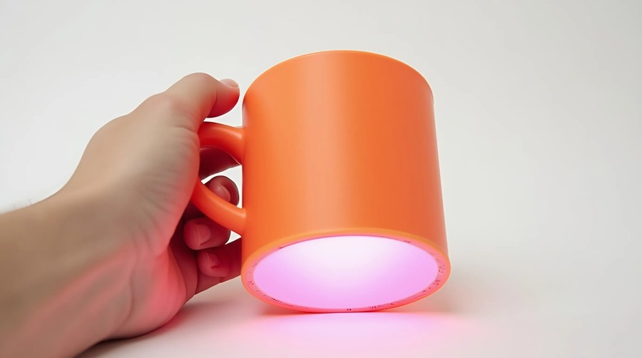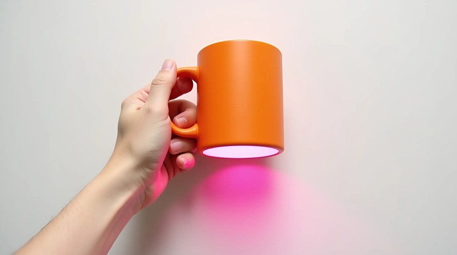prompt: bottom view, the hand holds an orange mug made of matte plastic, we see the bottom of the mug with a pink screen from which bright pink light oozes. white background