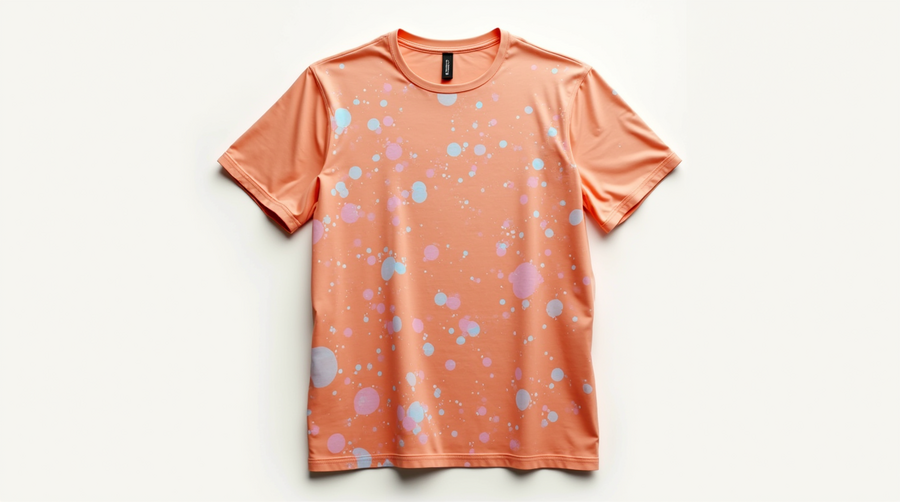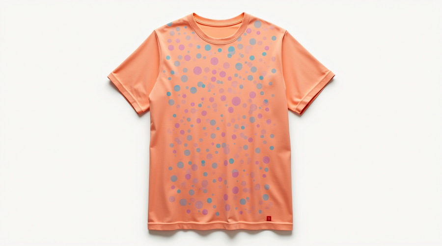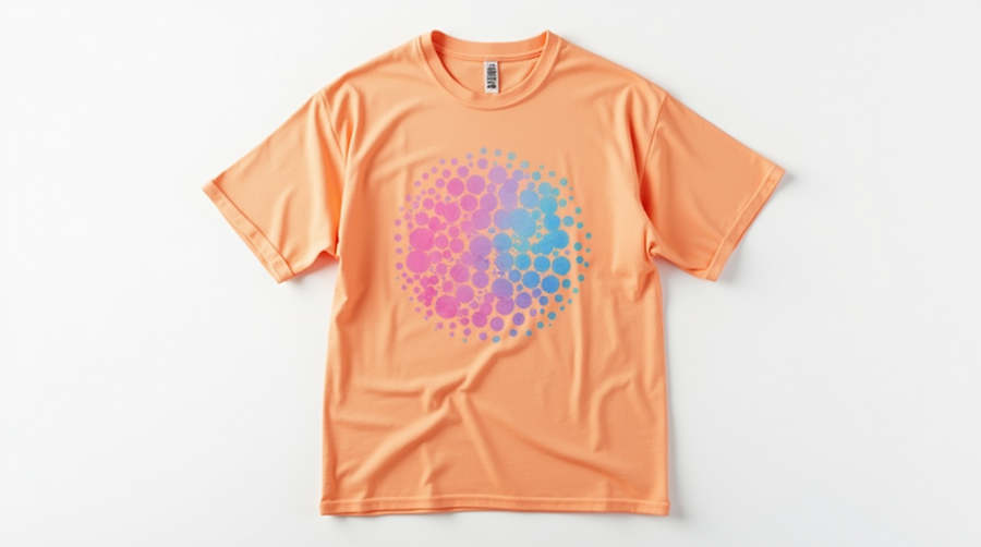 prompt: mockup top view light orange oversize T-shirt with a print of a large number of pink and blue round flat particles, white background