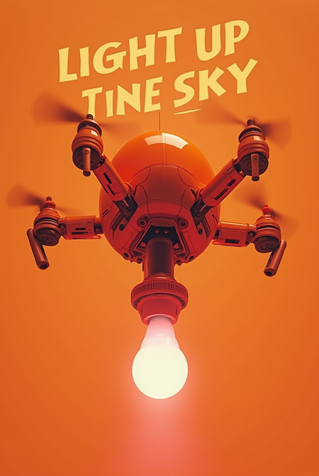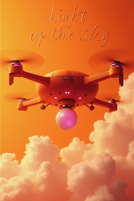 prompt: poster, big «light up the sky» inscription, dynamic composition, plastic mate orange futuristic modern brutalist detailed flying drone with a with a round streamlined shape and a big pink light glowing bulb on the bottom inside the drone, orange background