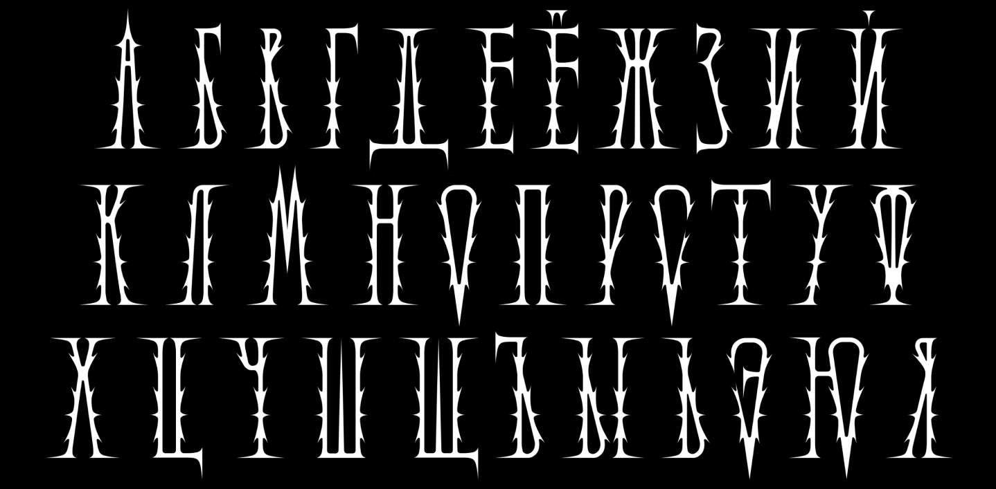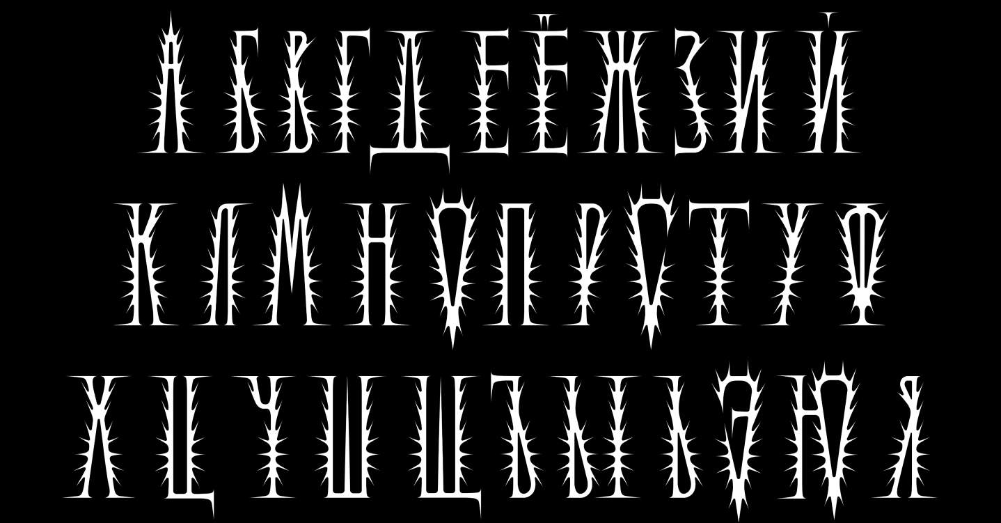 акцидентный шрифт КОЛЮЧКИ вдохновлён густым русским лесом. в его основу легла не нарочитая историчность вязи, а форма ветвей терновых кустов и ощущение сказочности острых иголок. одновременно острый и игривый, устойчивый и веселый, аутентичный и современный
