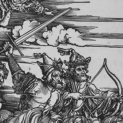 На этой гравюре изображены четыре всадника апокалипсиса. Слева-направо: Смерть, Чума, Война и Голод. Эти четыре героя стремительно несутся вперёд, не замечая преград. Художник подчеркивает это при помощи штрихов на заднем плане и общей стремительной композиции.