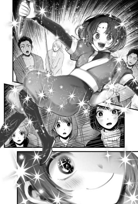 Другие второстепенные, но важные персонажи (Ари́ма Канна, Мем-чан, Камики) представляют собой разные типы цифровой экспозиции. Канна — бывшая дитя-звезда, чья карьера переживает кризис — это фигура постмедийной травмы, когда ранняя слава оборачивается выгоранием. Её визуальная палитра мрачнее: тёмные фоны, глубокие тени на лице, подчеркнутая асимметрия — всё говорит о внутреннем конфликте, попытке «удержать себя» в разваливающемся нарративе. Она буквально борется за право быть собой вне образа, что делает её одной из наиболее трогательных фигур в манге.