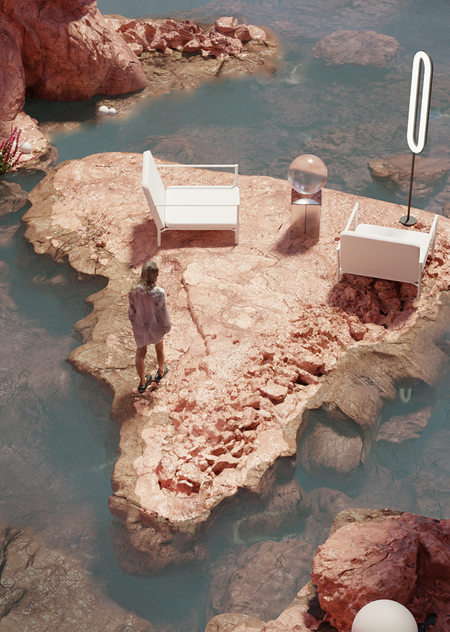 Центр композиции — это шар воспоминаний о прожитом. Он невесом и прозрачен, ведь теперь время изменило свою форму. Перед небольшим островком с двумя белыми стульями открывается вид на вечность, где всегда светло, спокойно и радостно. Фигура Творца в сцене не видна, но его присутствие можно угадать по следам на воде.
