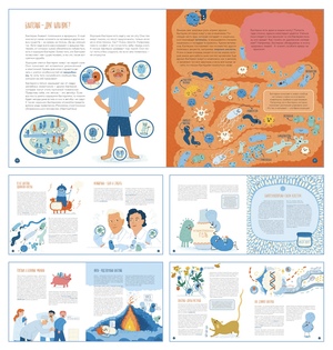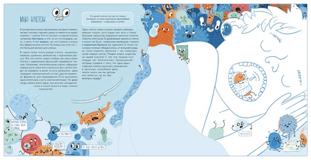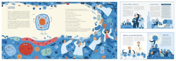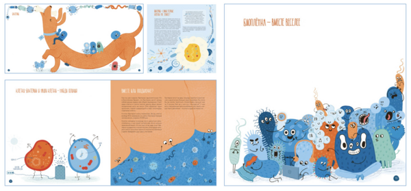 Моя концепция заключалась в том, чтобы создать яркие и запоминающиеся иллюстрации, которые бы дополняли текст и помогали детям лучше понять сложные биологические концепции. Я стремилась сделать иллюстрации лёгкими и доступными, чтобы они не перегружали восприятие текста. Для этого я придумала главного персонажа — милую клетку, которая путешествует по страницам книги и знакомит читателей с различными типами клеток и их особенностями. Все бактерии изображены как одушевлённые персонажи, что делает книгу ещё более увлекательной.
