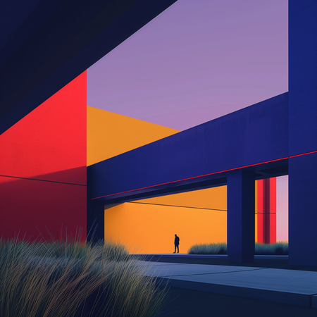 flyovers in blue, red and yellow tones, photorealism, David Hockney style, purple sky, shot in Michael Kenna style, 3D render, minimalism, monochromatic color scheme, rule of thirds composition