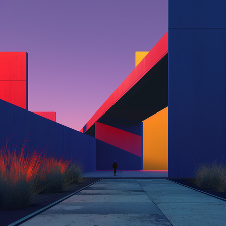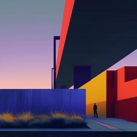 Yellow sidewalk, details in blue, red and yellow tones, realism, David Hockney style, purple sky, shot in Michael Kenna style, 3D render, minimalism, monochromatic color scheme.