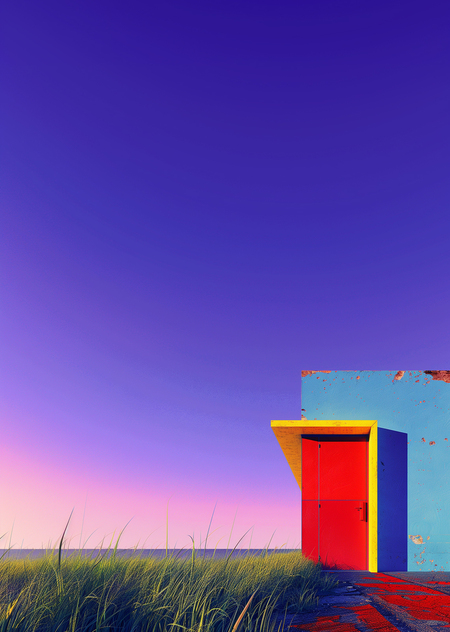 Cityscape with architectural elements in blue, red and yellow tones, close-up of a David Hockney style door, on a level ground with grass in the foreground, purple sky, shot in Michael Kenna style, 3D