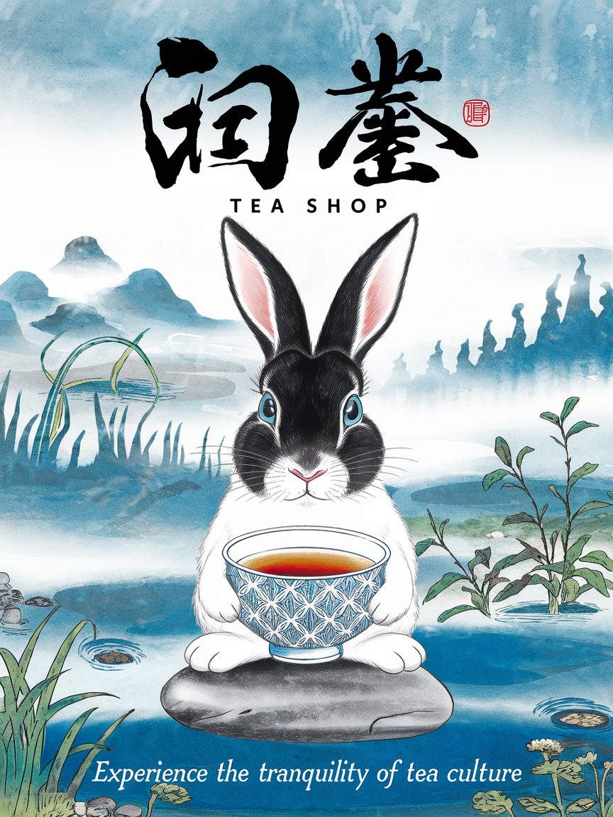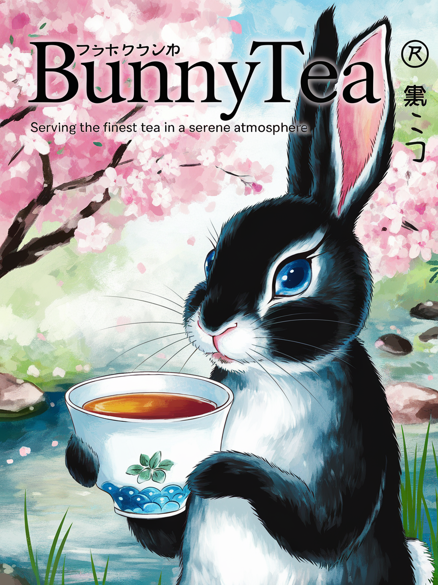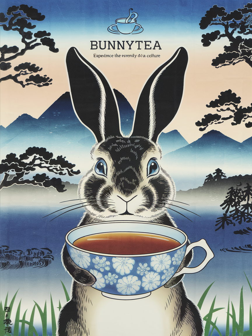 Для создания плакатов использовался Ideogram. Promt: Create a promotional poster for the tea shop «BunnyTea.» The poster should feature a rabbit with black ears and blue eyes, holding a white and blue teacup filled with tea. The design should reflect the style of traditional Japanese art, creating a serene and inviting atmosphere that showcases the beauty of tea culture. Include the shop’s name, «BunnyTea,» prominently on the poster along with a captivating tagline.