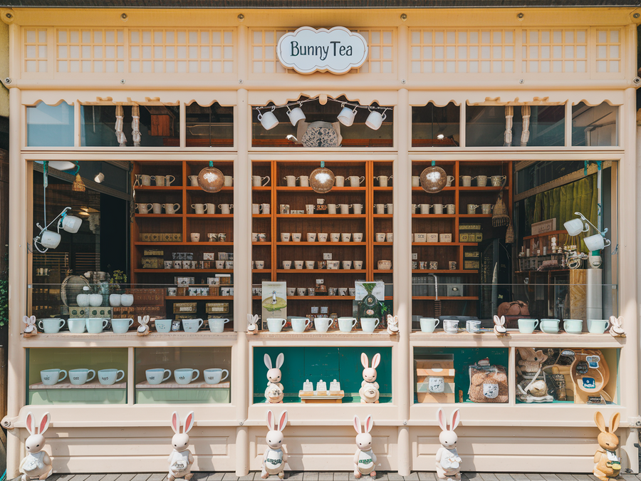 Для создания фасада использовался Leonardo Diffusion XL, частично — Ideogram. Promt: Create a photograph of the exterior of the BunnyTea tea café designed in a traditional Japanese style. The windows should showcase mugs and teapots, as well as shelves filled with an assortment of teas and wooden bunny figurines. The scene should depict a sunny day in an urban setting, with wooden rabbit figurines placed around the café.