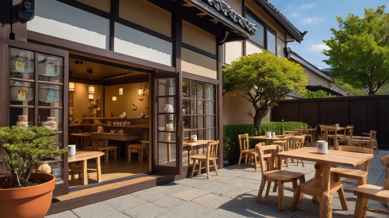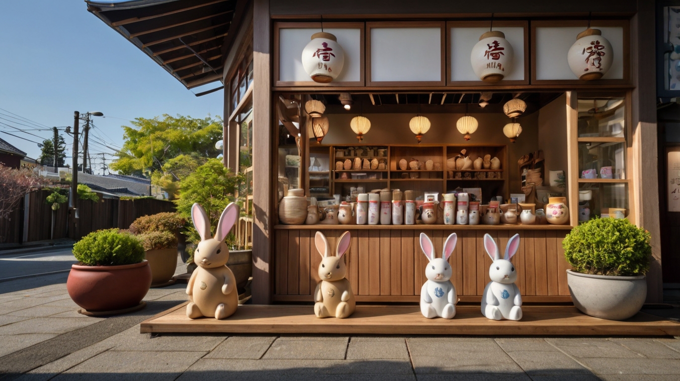 Сгенерированный промт: напиши промт на английском для фотографии наружного вида чайного кафе BunnyTea в традиционном японском стиле. В окнах видны кружки и чайники, а так же полки с ассортиментом чая и деревянных фигурок зайчиков. На улице солнечный день, магазин находится в городе, вокруг деревянные фигурки кроликов.