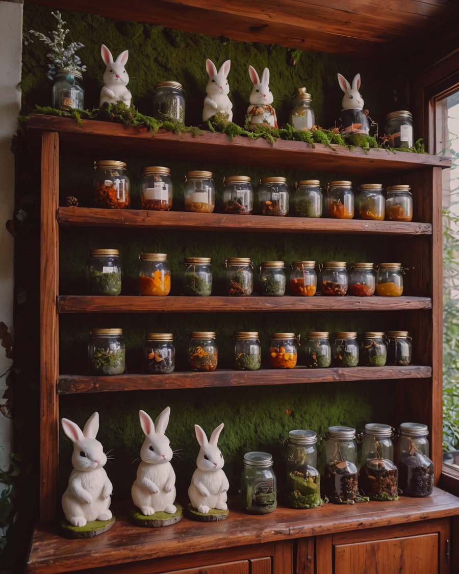 Promt для интерьера: Capture a photograph of the interior of BunnyTea café, designed in a traditional Japanese style. The scene should showcase wooden shelves filled with glass jars containing an array of different teas, beautifully labeled and organized. Incorporate soft, natural lighting that enhances the serene atmosphere, along with charming wooden bunny figurines artfully placed throughout the space. The overall theme should reflect the love for tea and the playful spirit of the bunnies.
